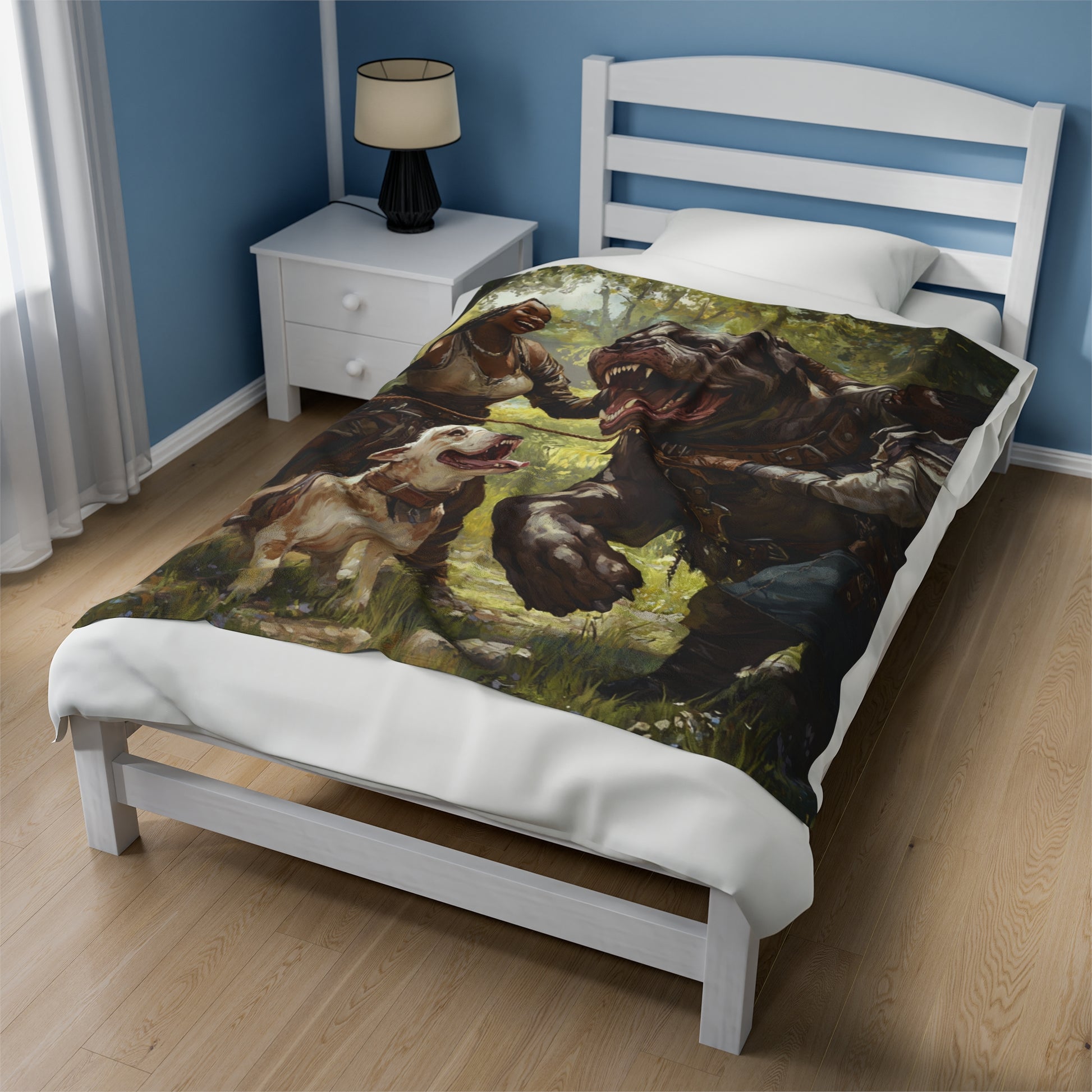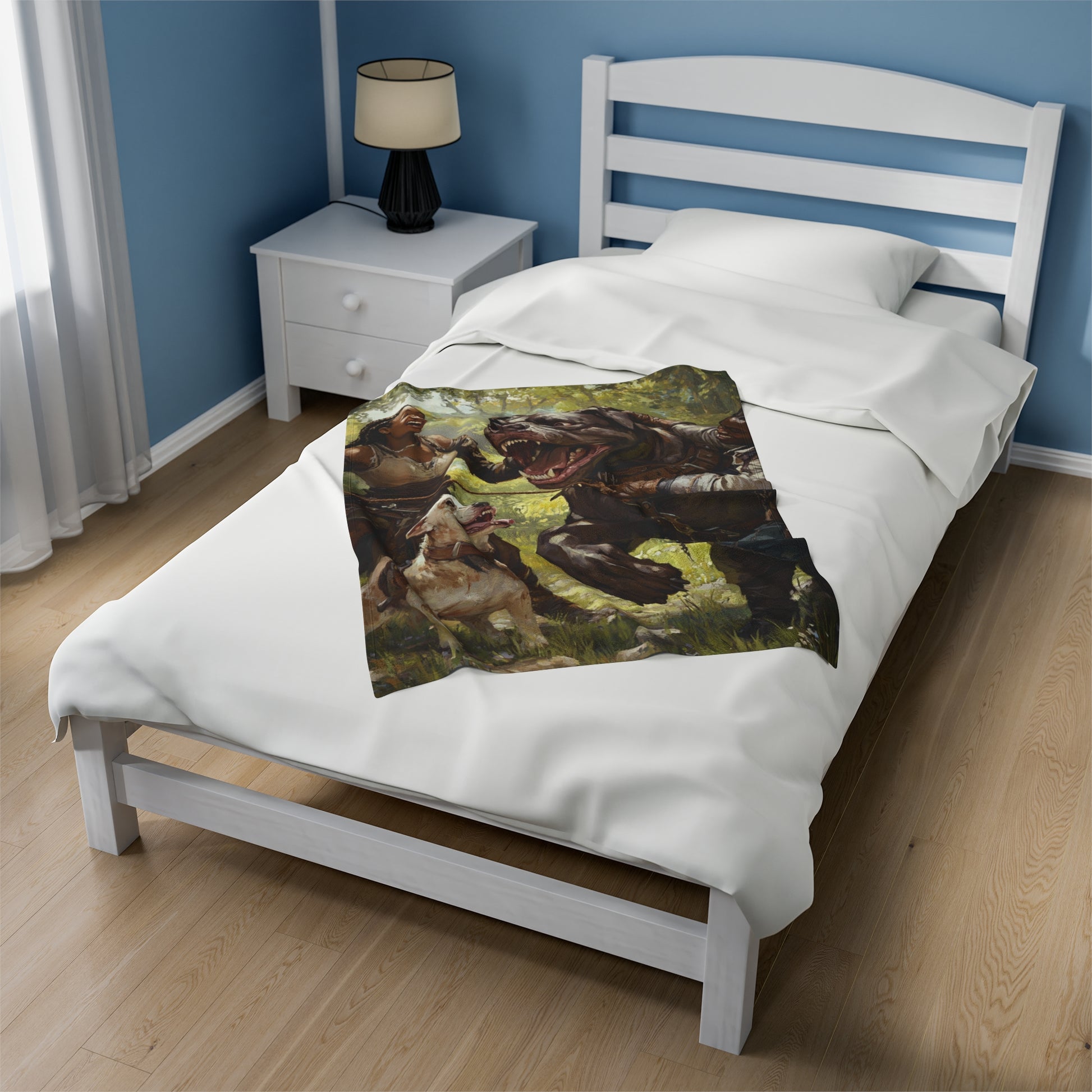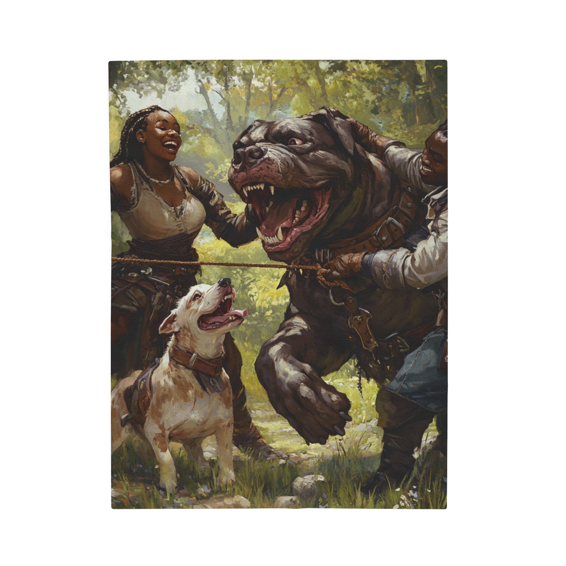 Enjoy an enchanting scene of adventurers playing with their loyal dogs, one of which is a playful dire pit-bull. This velveteen plush blanket is perfect for fantasy lovers and those who enjoy a touch of magic in their décor. Ideal for cozying up during the holidays or as a unique gift for fans of fantasy and adventure.