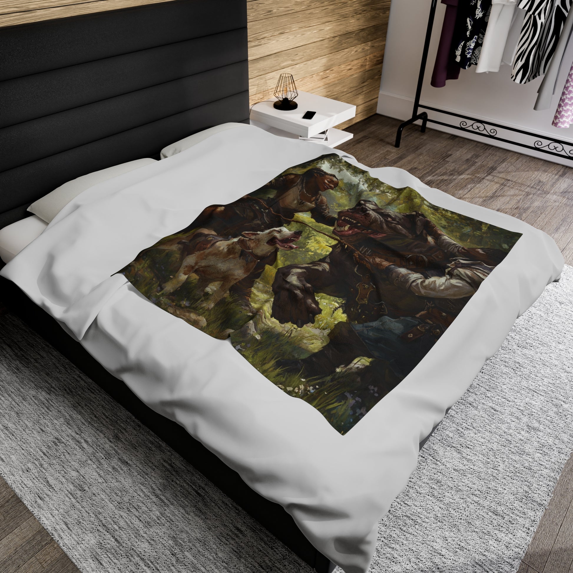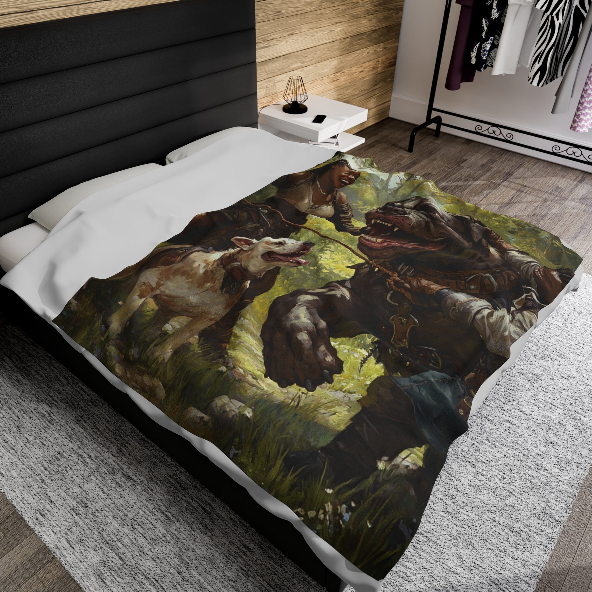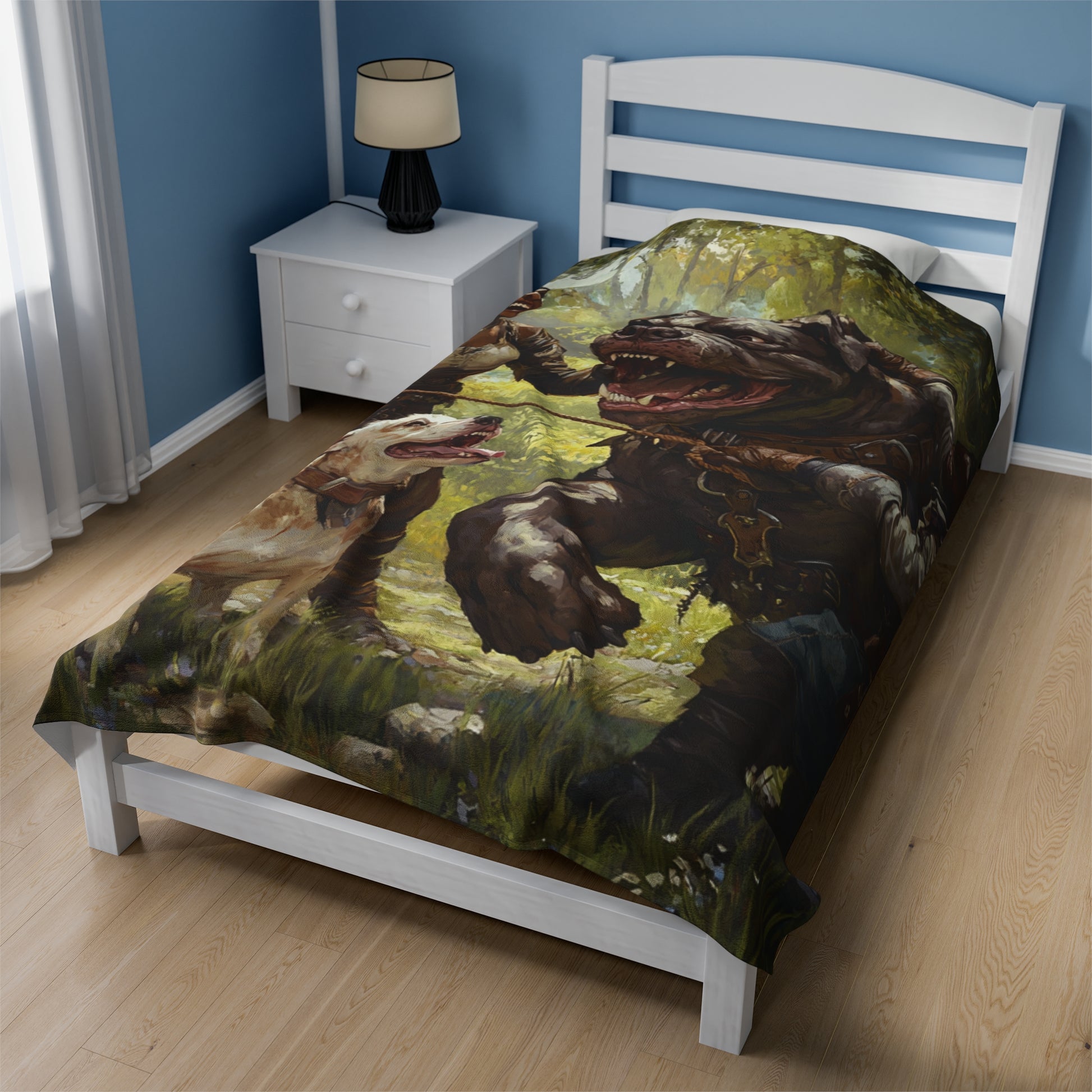 Enjoy an enchanting scene of adventurers playing with their loyal dogs, one of which is a playful dire pit-bull. This velveteen plush blanket is perfect for fantasy lovers and those who enjoy a touch of magic in their décor. Ideal for cozying up during the holidays or as a unique gift for fans of fantasy and adventure.