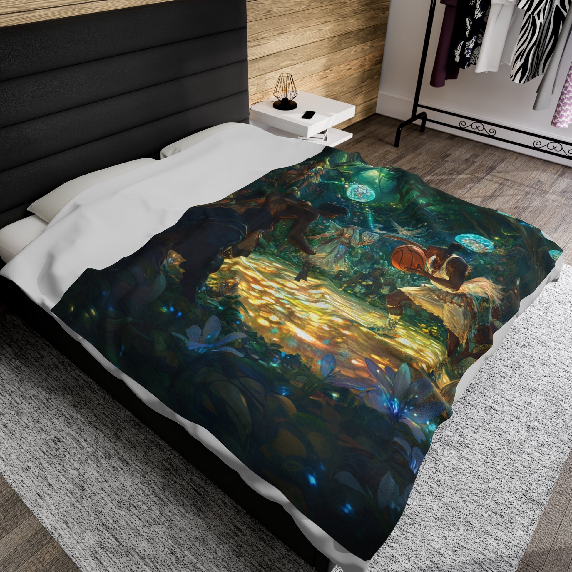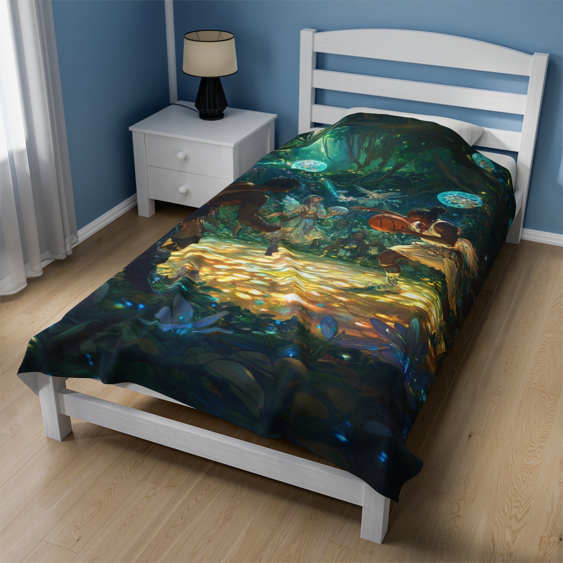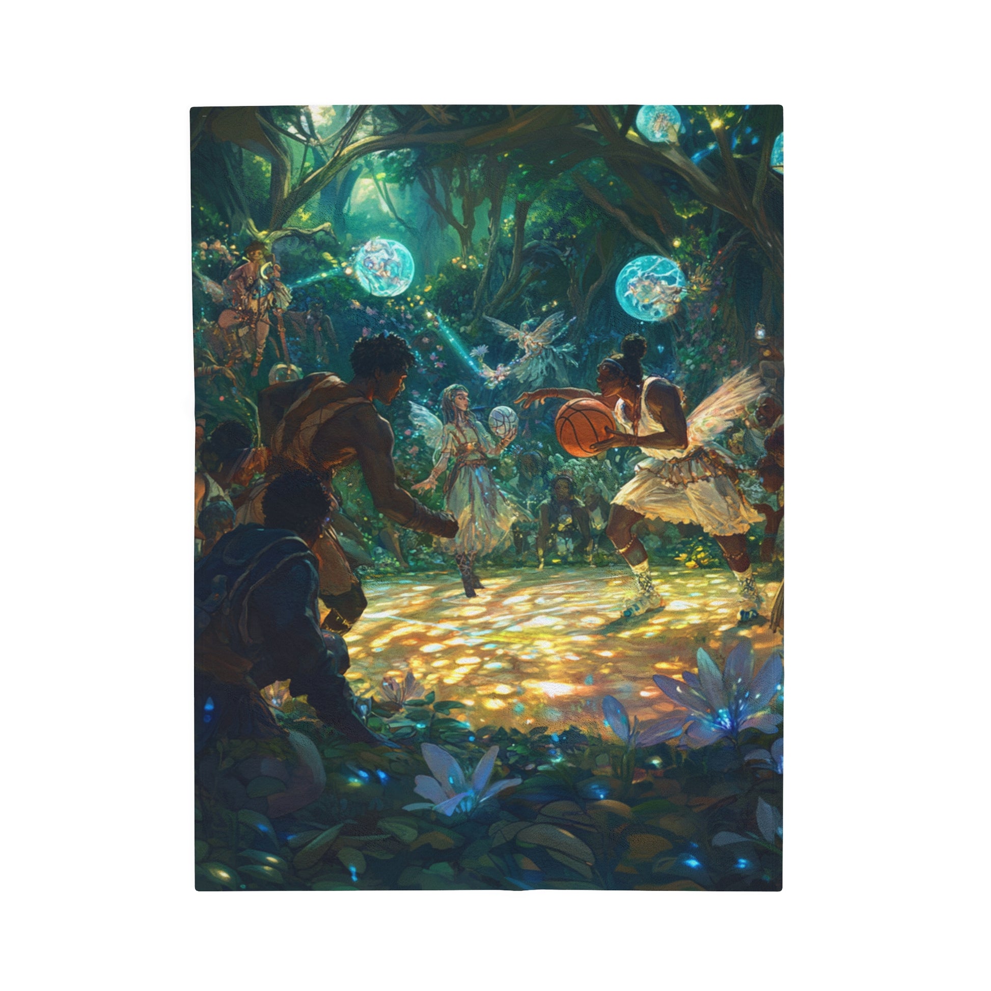Experience the excitement of a rousing sporting event between adventurers and athletic fey, with faeries watching in awe and excitement. This velveteen plush blanket is perfect for fantasy lovers and those who enjoy a touch of magic in their decor. Ideal for cozying up during the holidays or as a unique gift for fans of fantasy and adventure.
