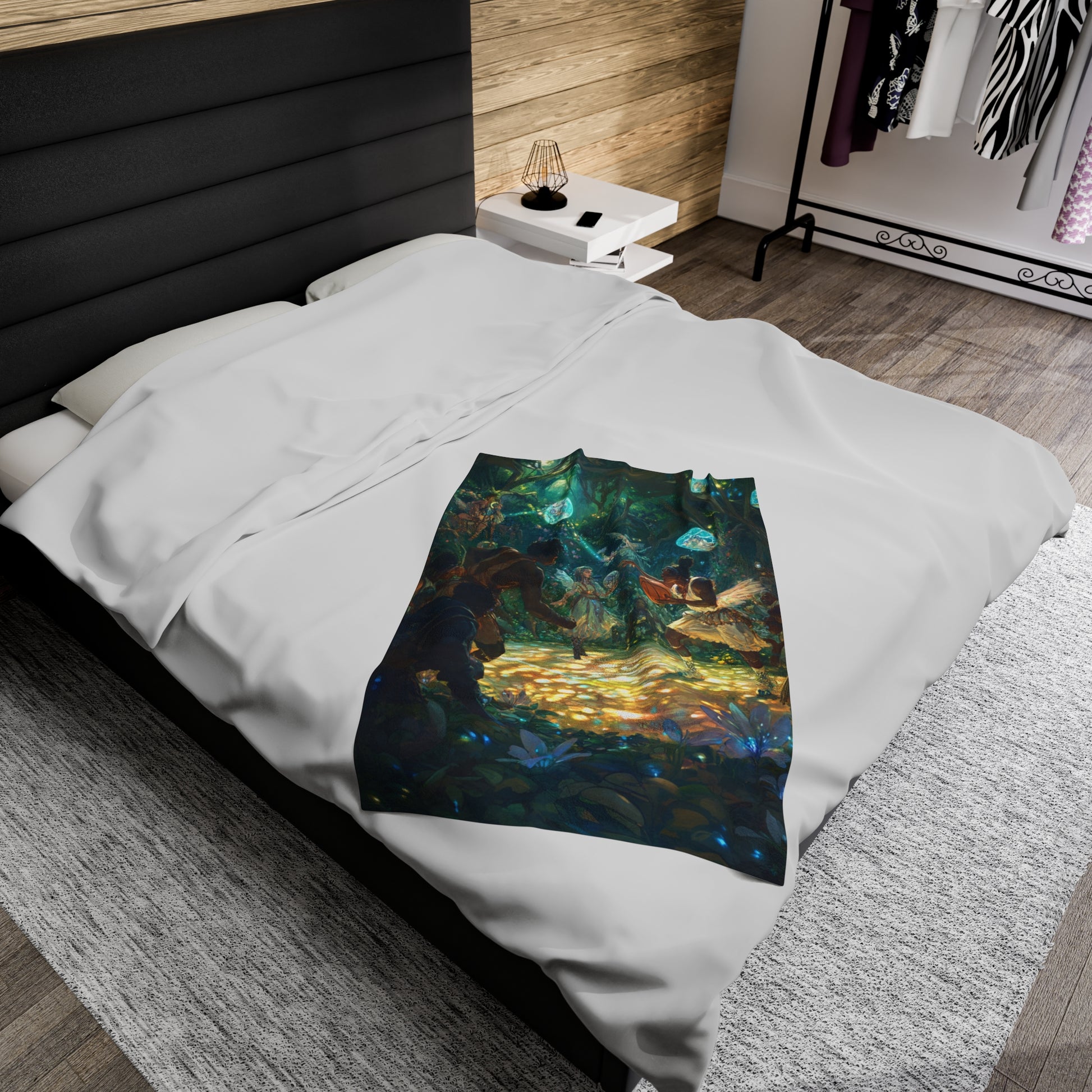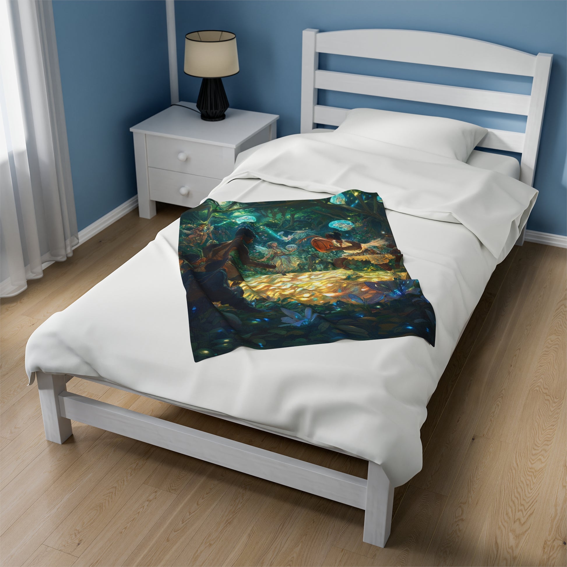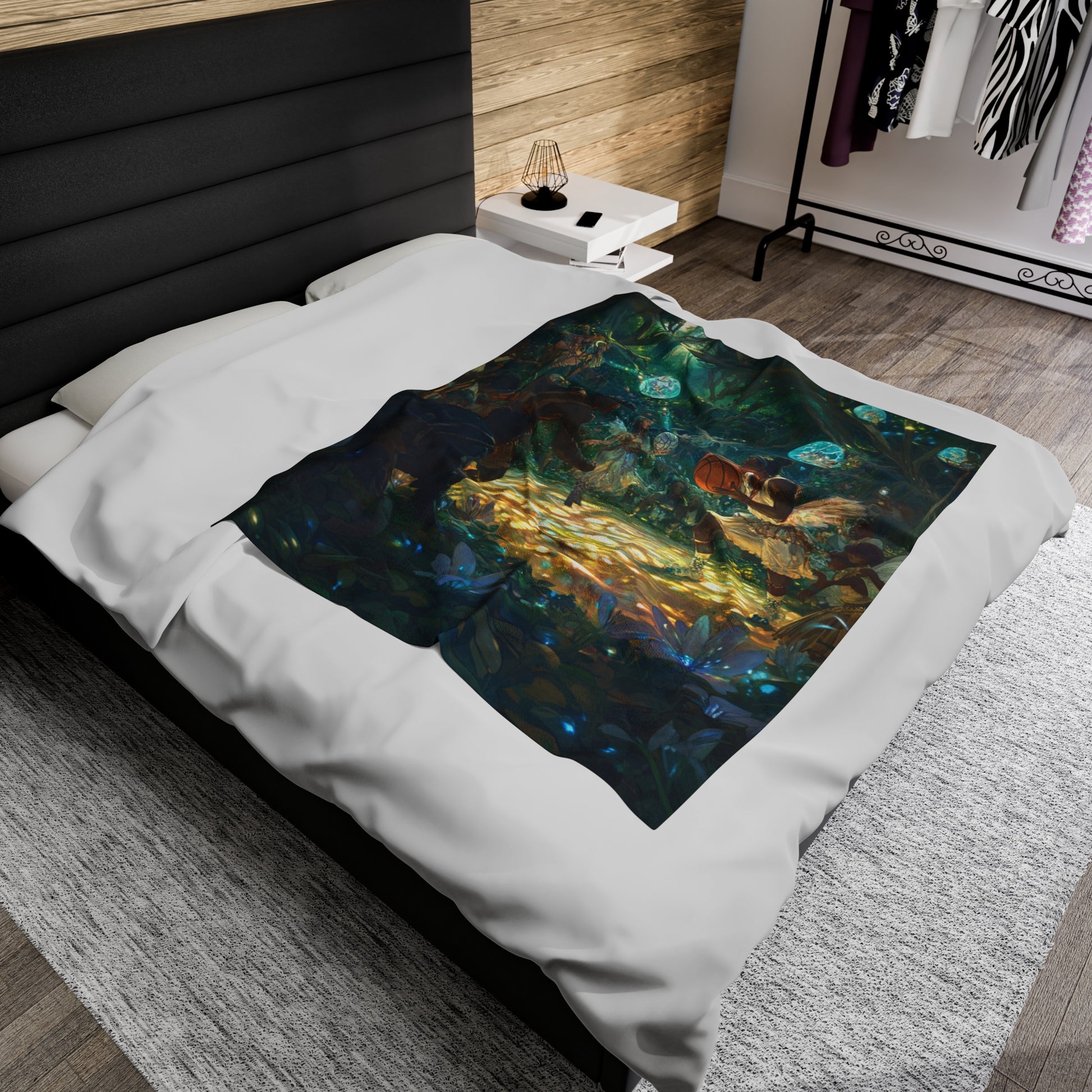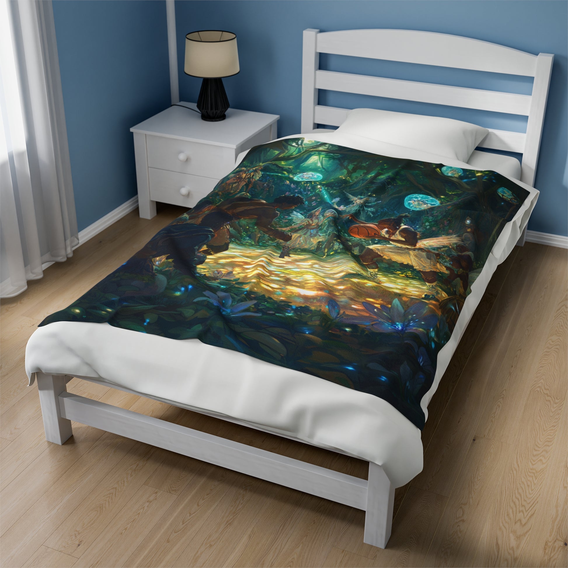Experience the excitement of a rousing sporting event between adventurers and athletic fey, with faeries watching in awe and excitement. This velveteen plush blanket is perfect for fantasy lovers and those who enjoy a touch of magic in their decor. Ideal for cozying up during the holidays or as a unique gift for fans of fantasy and adventure.